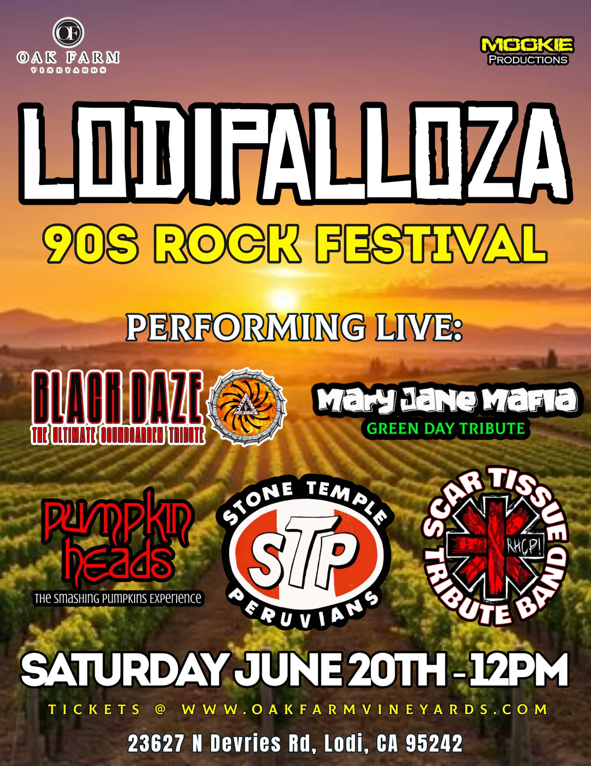Get ready for a full day of flannel, distortion, and vineyard vibes at LODIPALOOZA – The Ultimate 90s Rock Festival!